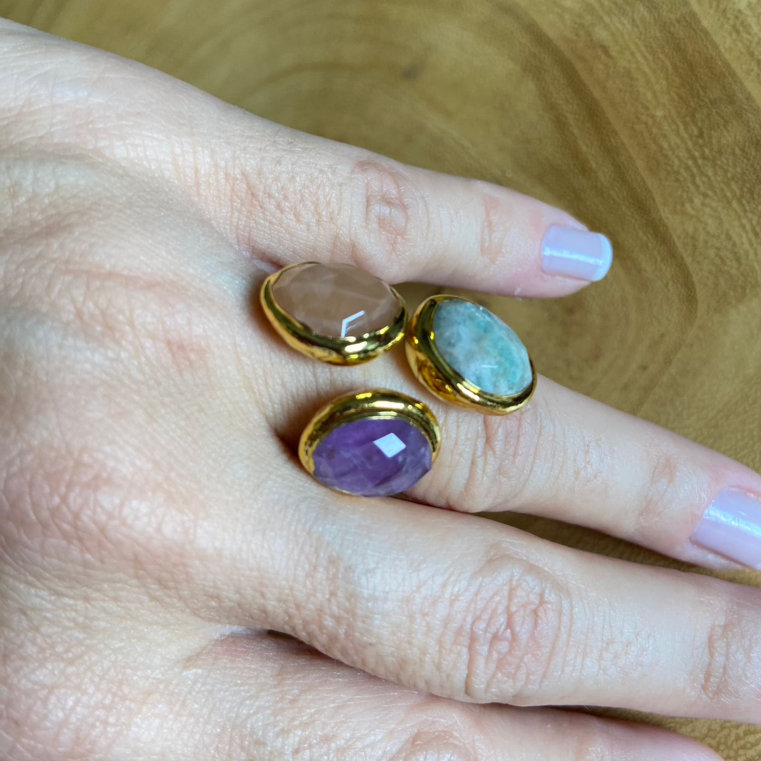 Anel trio de pedras naturais, Amazonita, Ametista e Pedra do Sol, em aço inoxidável com banho de ouro 18k. Tamanho AJUSTÁVEL.
