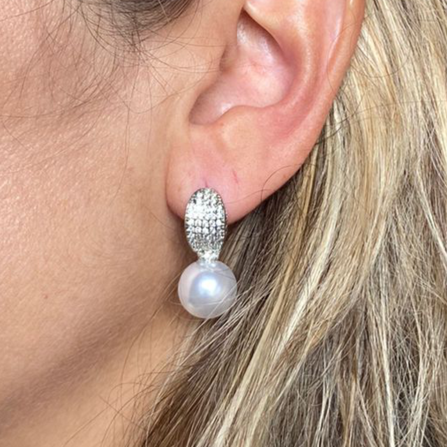 Brinco de pérolas solitário com detalhe cravejado em zircônias. (Não acompanha o piercing fake).