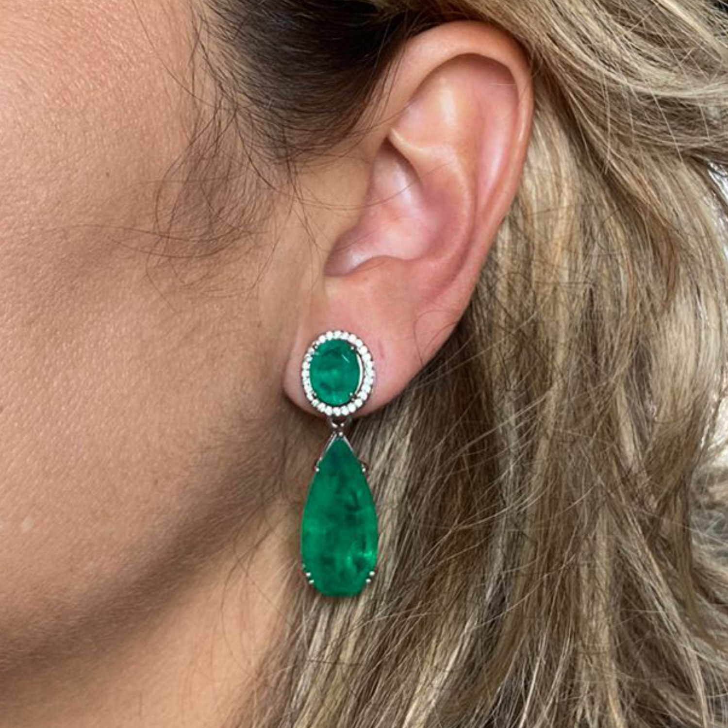 Brinco de esmeralda fuison cravejada e pendente de gota.