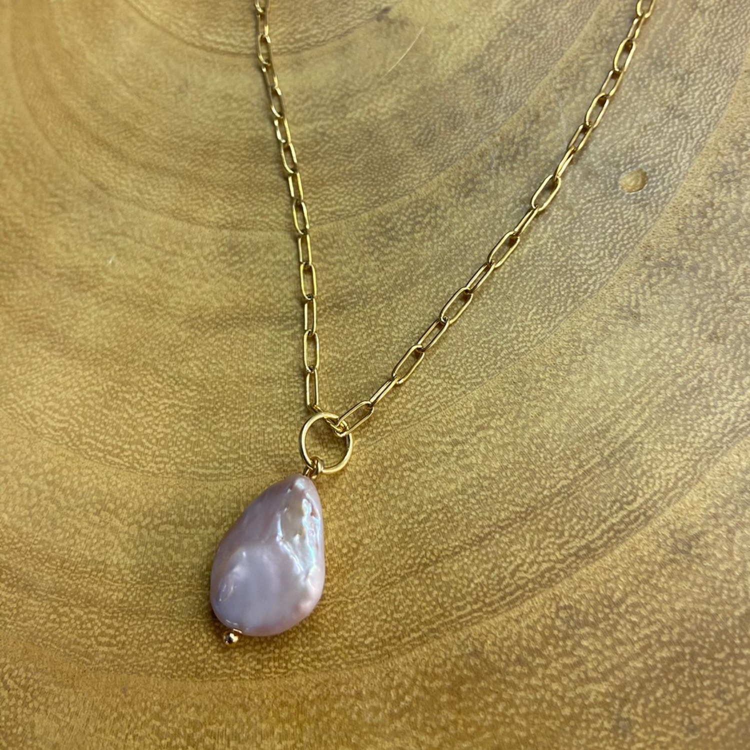 Colar na corrente de aço inoxidável com banho de ouro 18k e pingente de pérola natural barroca roxa.