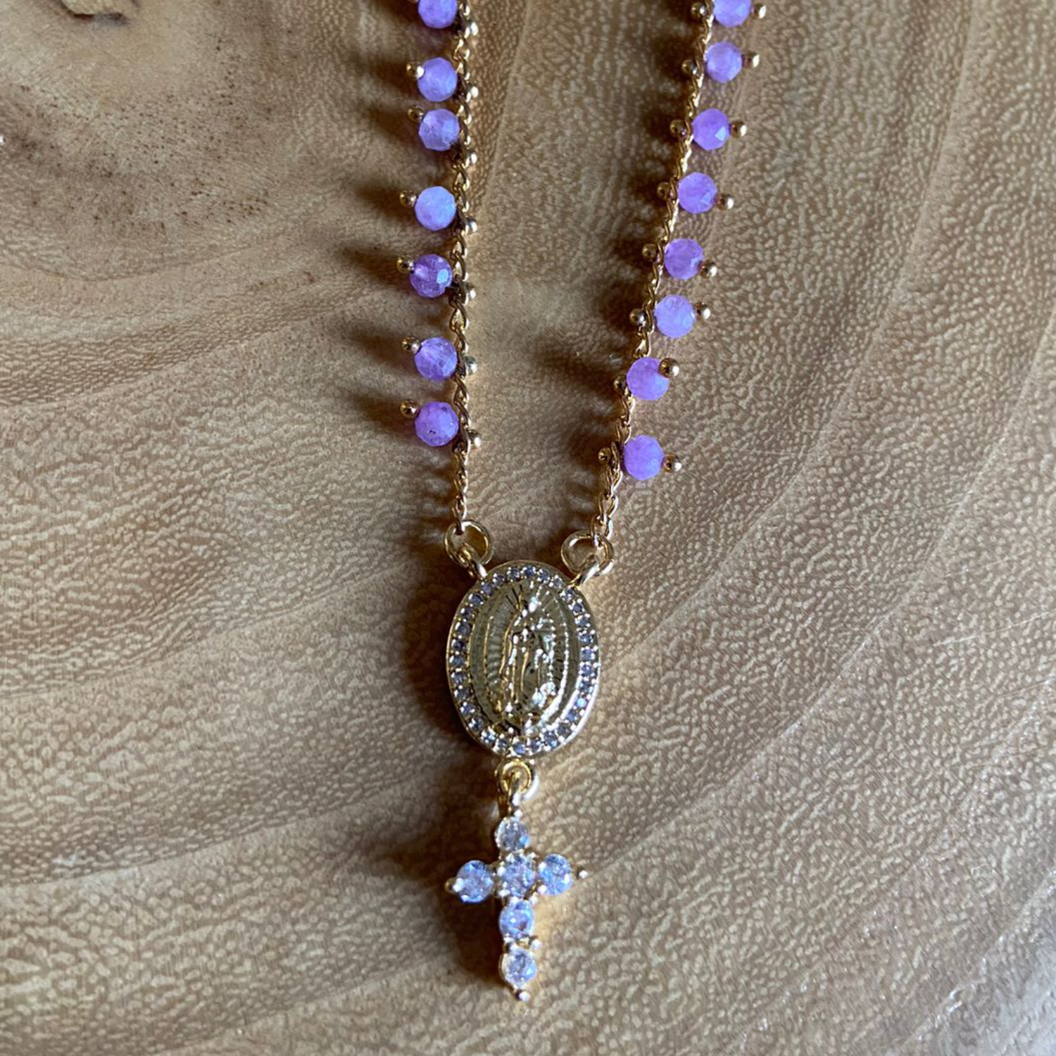Colar com pingente de santinho na corrente de pedra fusion roxa. Comprimento: 45+5cm