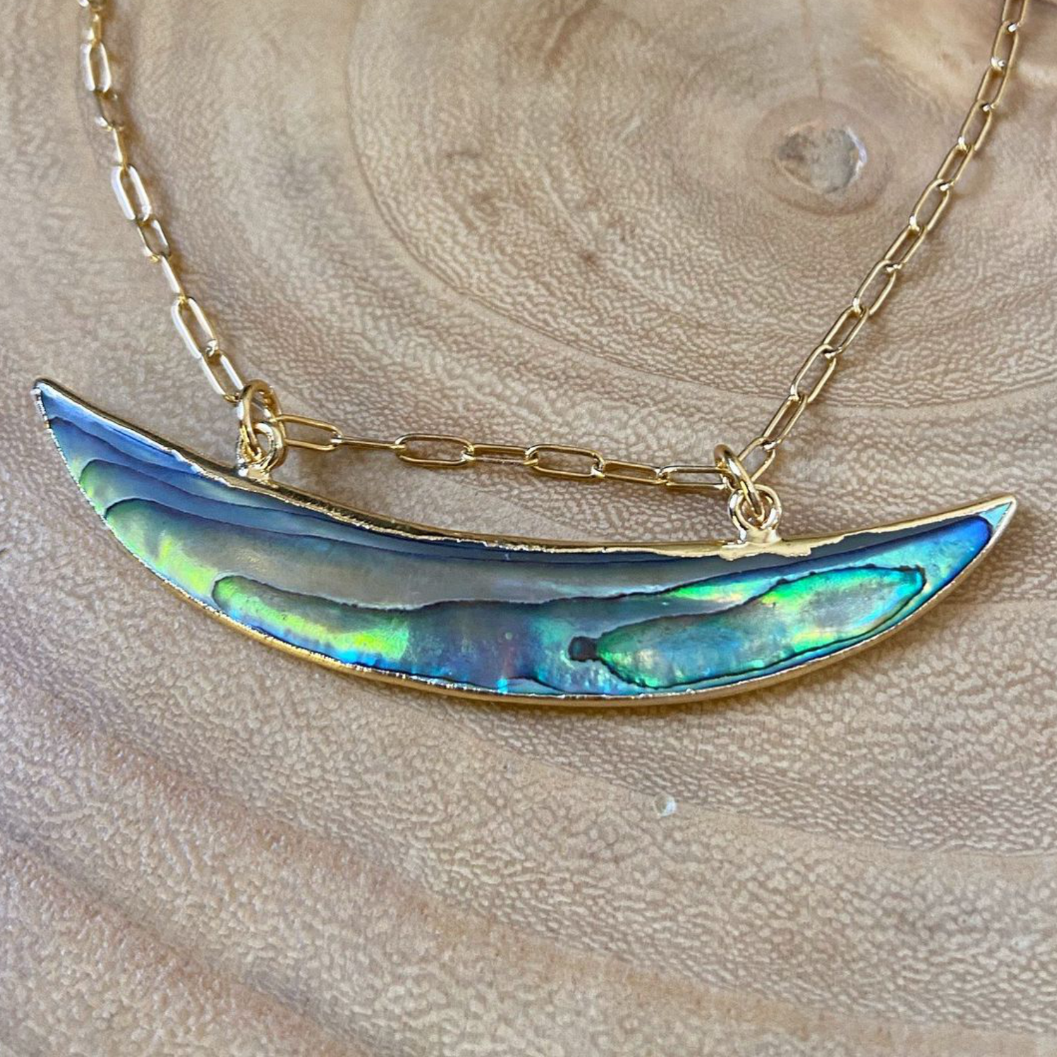 Colar no trilho de corrente em aço inoxidável com banho de ouro 18k e pingente de meia lua de concha Abalone natural. Comprimento: 45+5cm