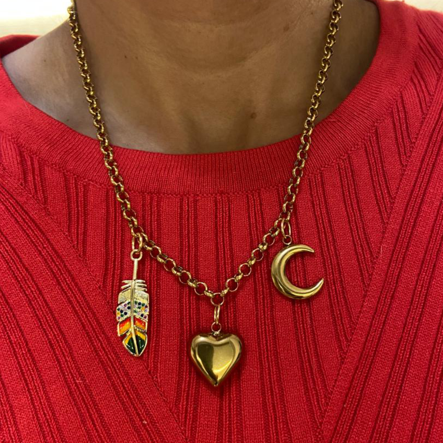 Colar na corrente 5mm em aço inoxidável com banho de ouro 18k com trio de pingentes de coração, pena e lua em aço esmaltado. Comprimento: 50+5cm