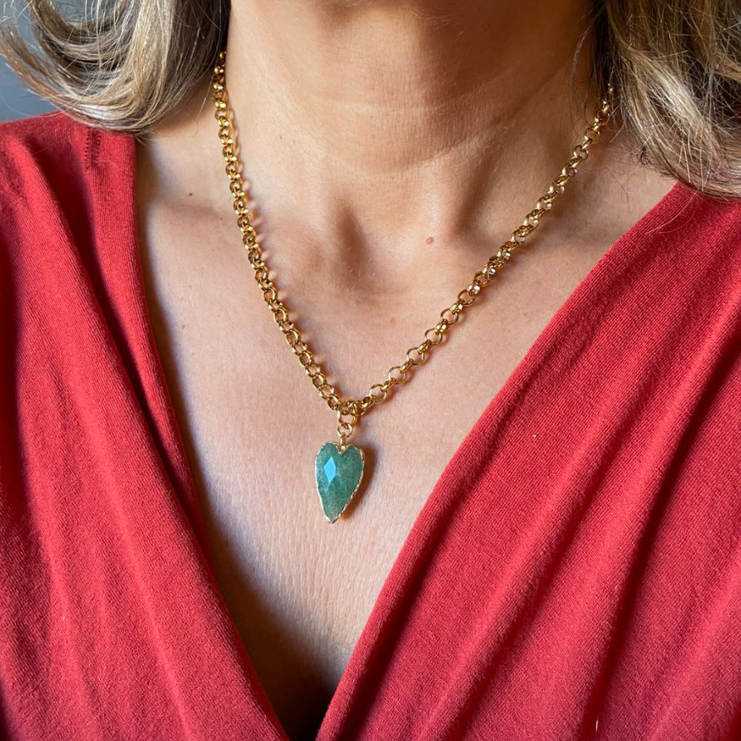 Corrente média 5mm em aço inoxidável com banho de ouro 18k e pingente de coração de pedra natral aventurine. Comprimento: 45+5cm