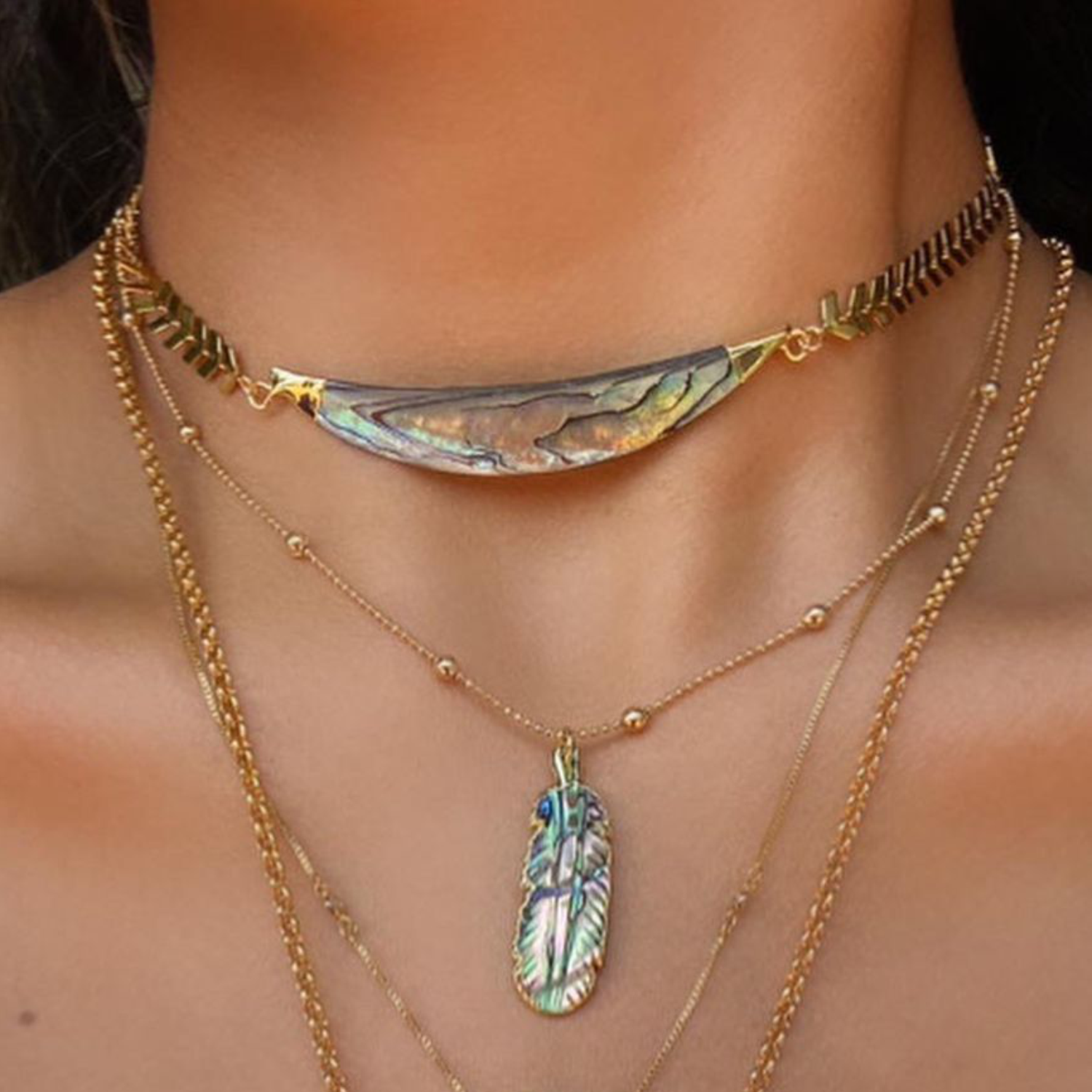 Colar de corrente com bolinhas intercaladas em aço inoxidável com banho de ouro 18k e pingente de pena entalhado na concha natural Abalone. Comprimento: 50+5cm