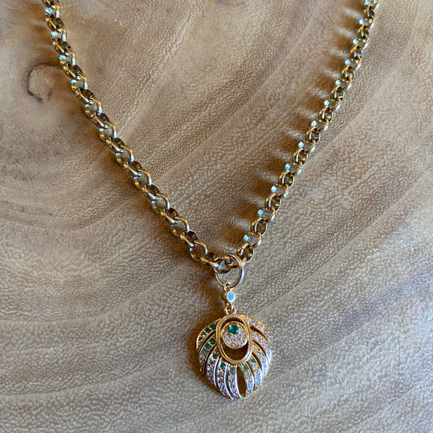 Corrente de elo português em aço inoxidável de 5mm de diâmetro e pingente de pena de pavão cravejado de zirconias. Comprimento: 50+5cm