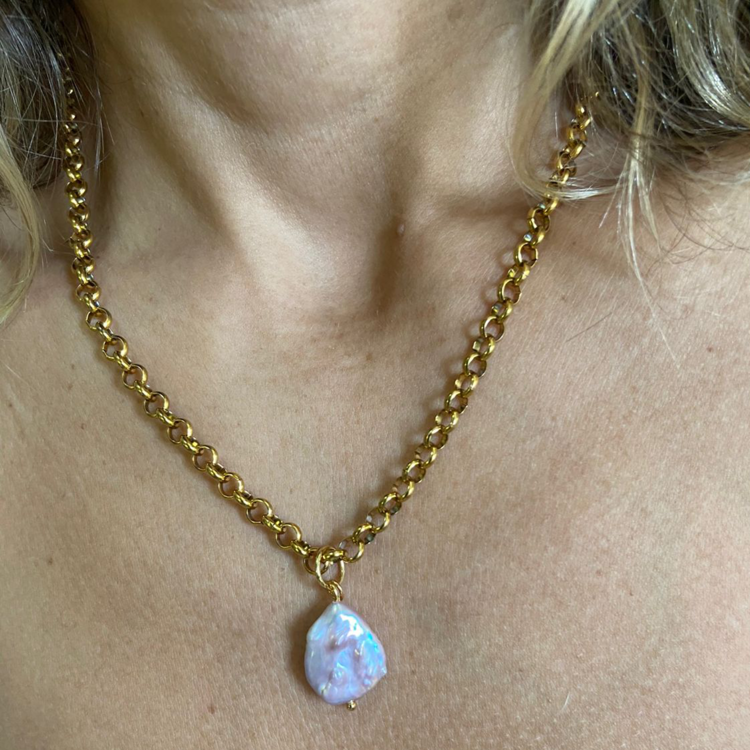 Colar de corrente de 5mm em aço inoxidável com banho de ouro 18k e pingente de peróla natural barroca em formato gota roxa. Comprimento: 45cm + 5 cm