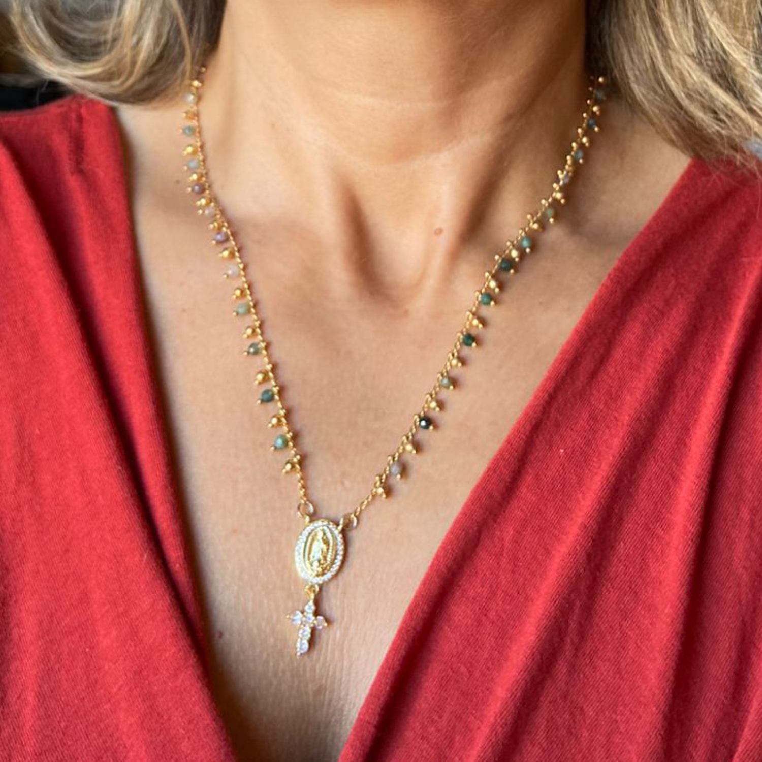 Colar de corrente de mix de ágata natural e pingente de santinha e cruz cravejada com de zircônias. Comprimento> 45+5cm
