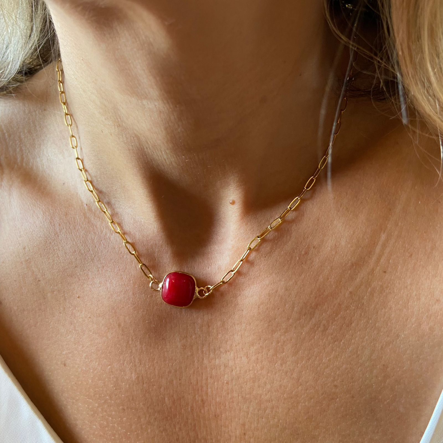 Gargantilha na corrente lisa em aço inoxidável com banho de ouro 18k, e pingente de jade vermelha natural, Comprimento: 35+5cm