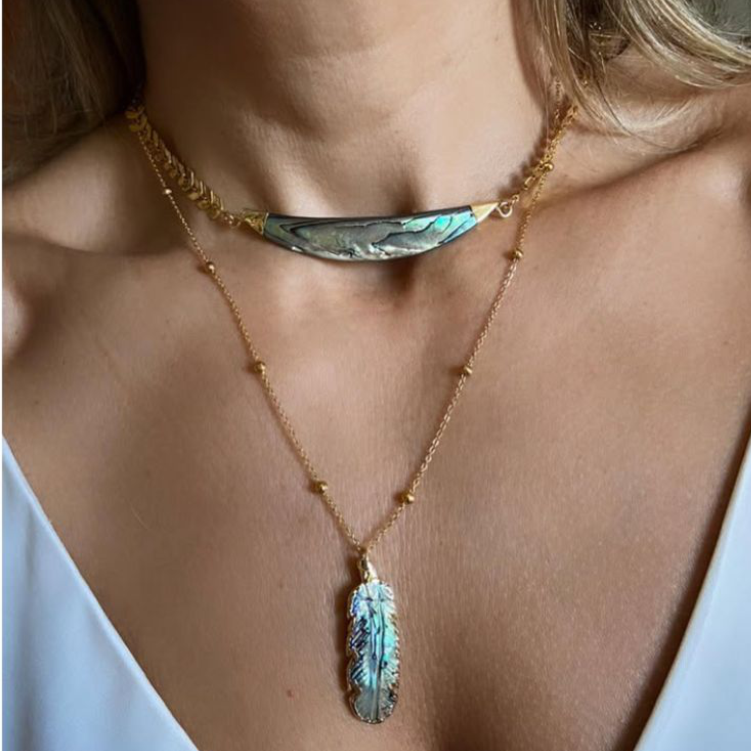 Gargantilha na corrente de aço com banho de ouro escama de peixe e meia lua de concha abalone natural.