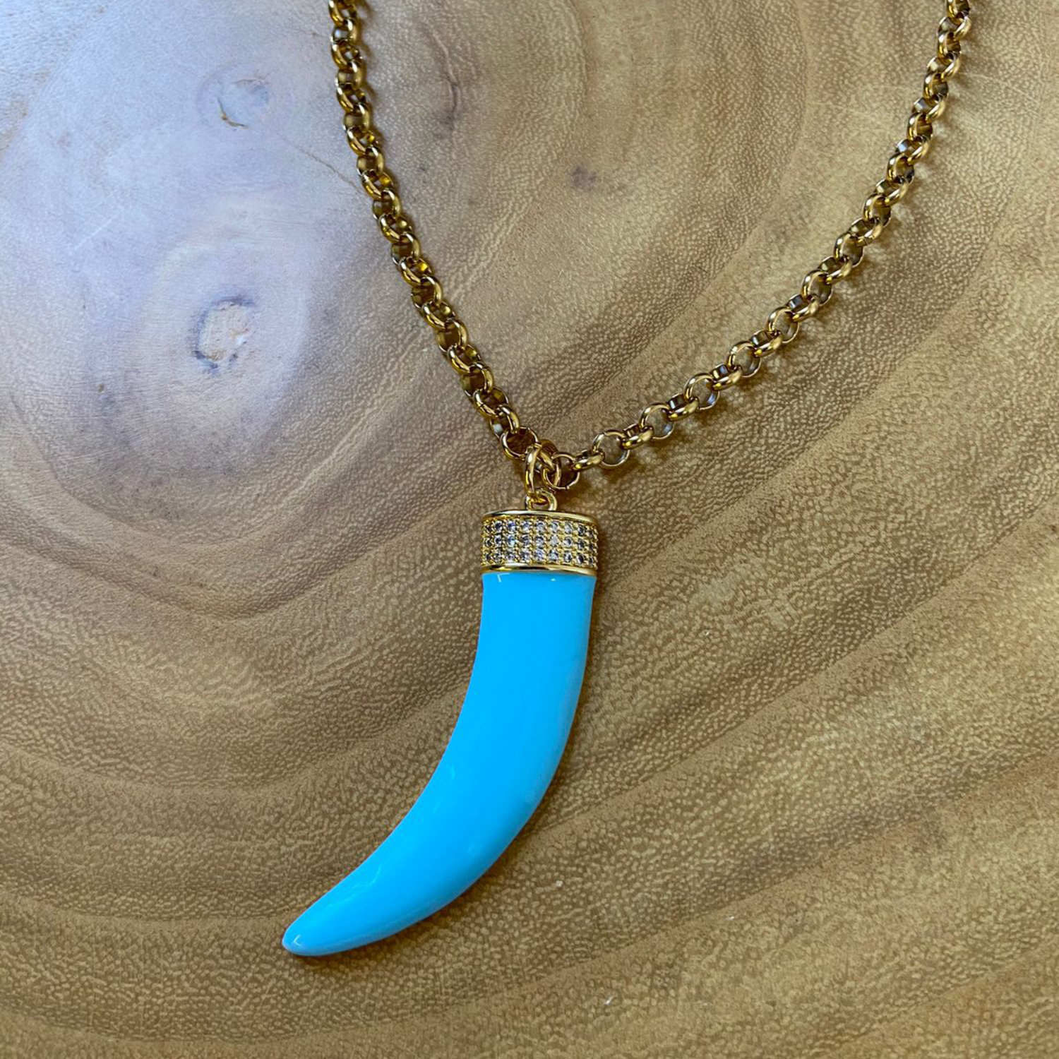 Colar alongado na corrente de elo português 5mm, em aço inoxidável com banho de ouro 18k, com pingente esmaltado de dente de sabre azul turquesa e cravejado com zircônias. Comprimento: 70cm