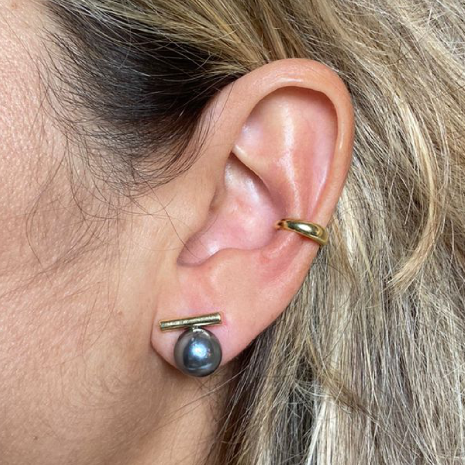 Brinco de pérola cinza e detalhe em banho de ouro 18k.