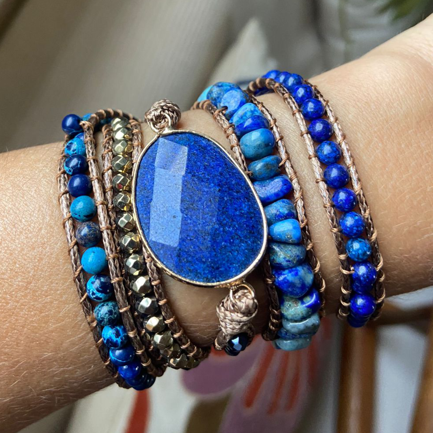 Pulseira de 5 voltas de mix de pedras naturais: lápis-lazúli e hematita.