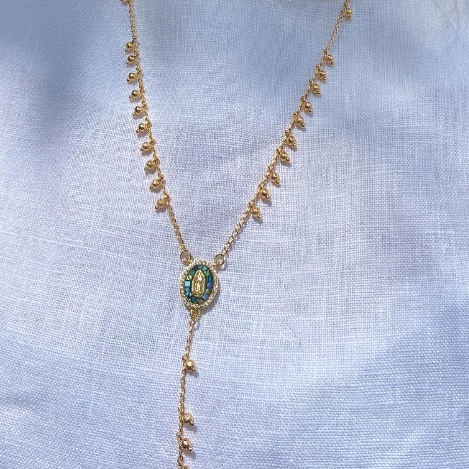 Terço colar na corrente de banho de ouro 18k com medalhinha e santinho de mosaico de concha natural Abalone.